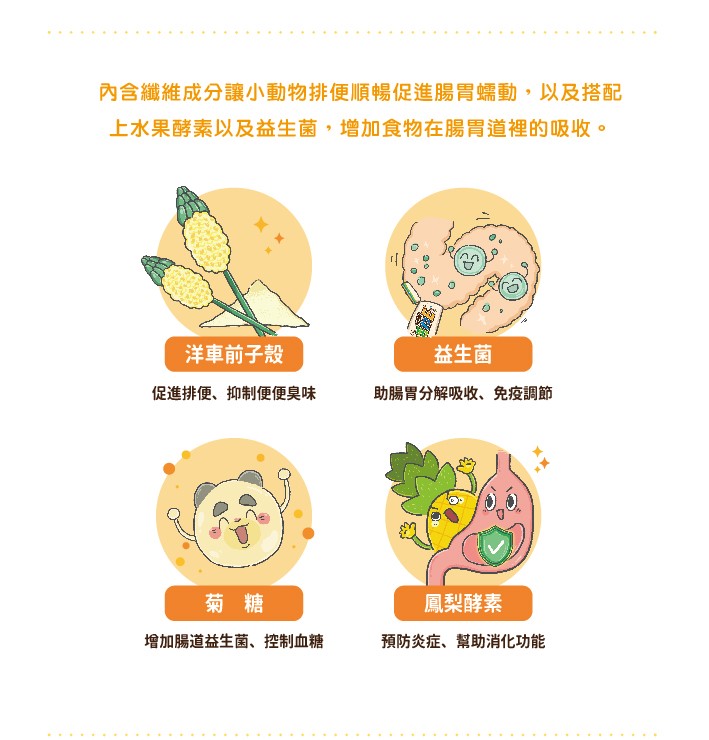 - 保護小動物的腸胃健康,內含纖維成分讓小動物排便順暢並促進腸胃蠕動,以及搭配上水果酵素以及益生菌,更增加食物在腸胃道裡的吸收。